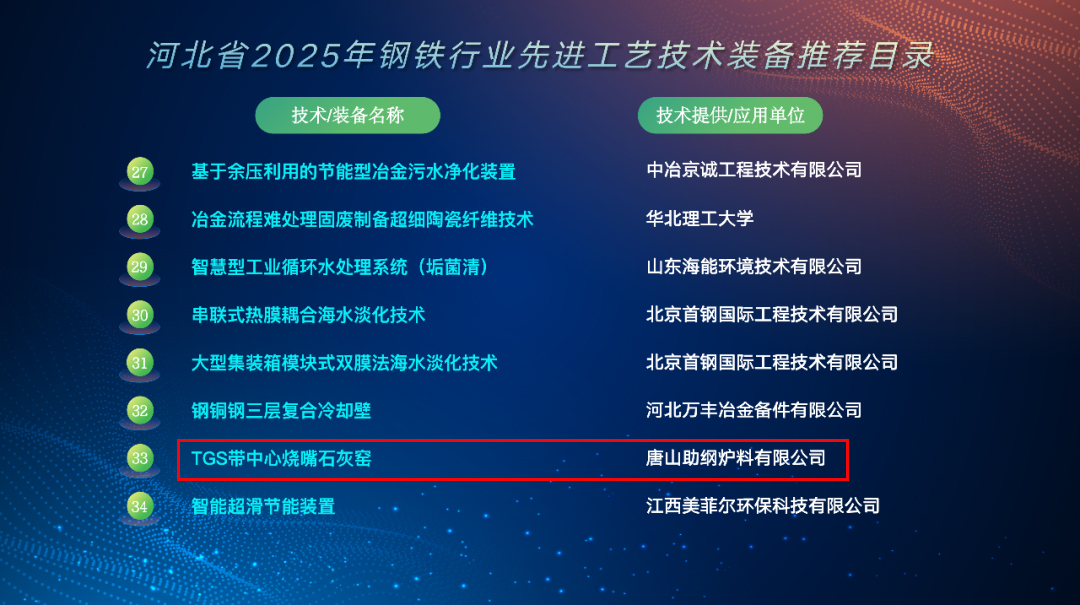 春潮涌动,万象更新。2026年3月26日,“2026第三届南湖大会(唐山)”盛大召开。在这场汇聚了政府领导、行业专家及钢铁产业链精英的盛会上,传来令人振奋的喜讯:唐山助纲炉料有限公司核心产品——TGS带中心烧嘴石灰窑,凭借其突出的技术先进性与显著的节能减排效果,成功入选《河北省2025年钢铁行业先进工艺技术装备推荐目录》!